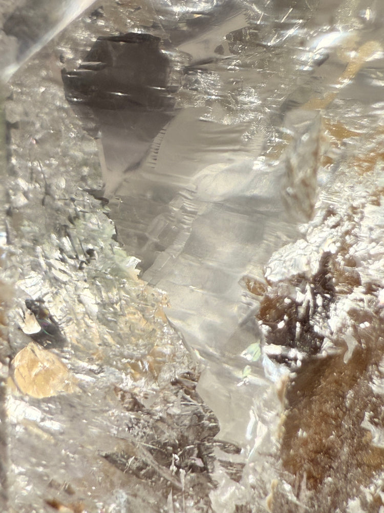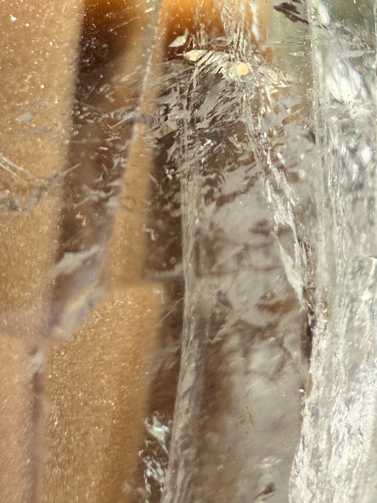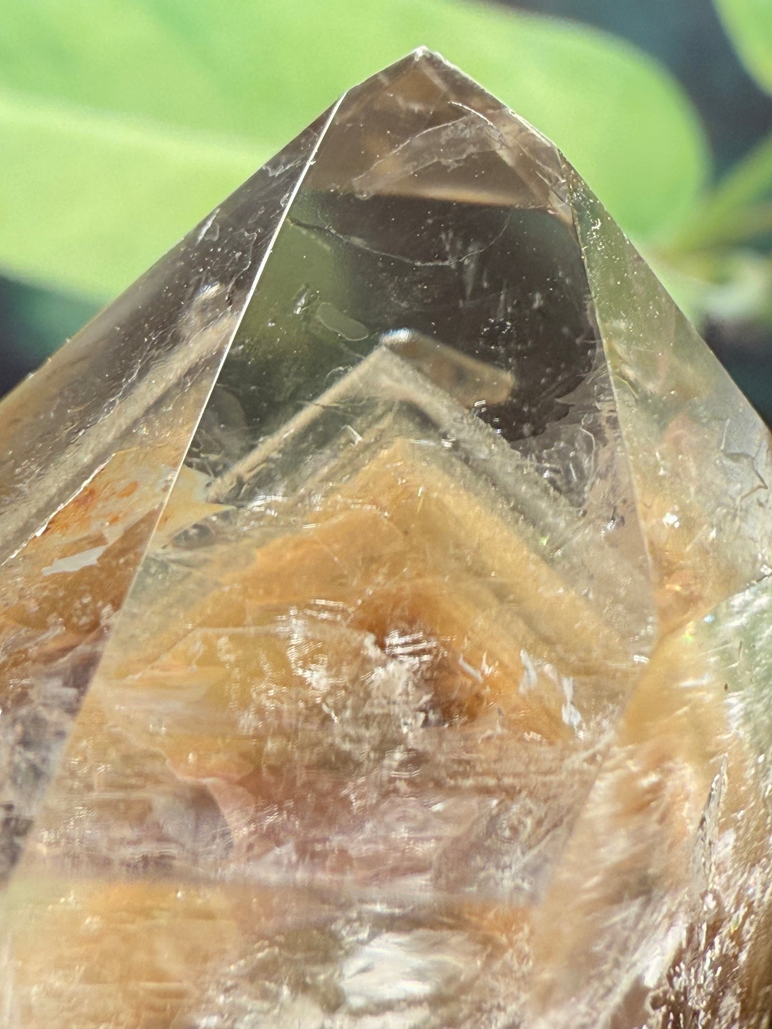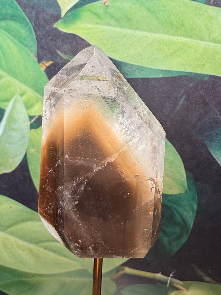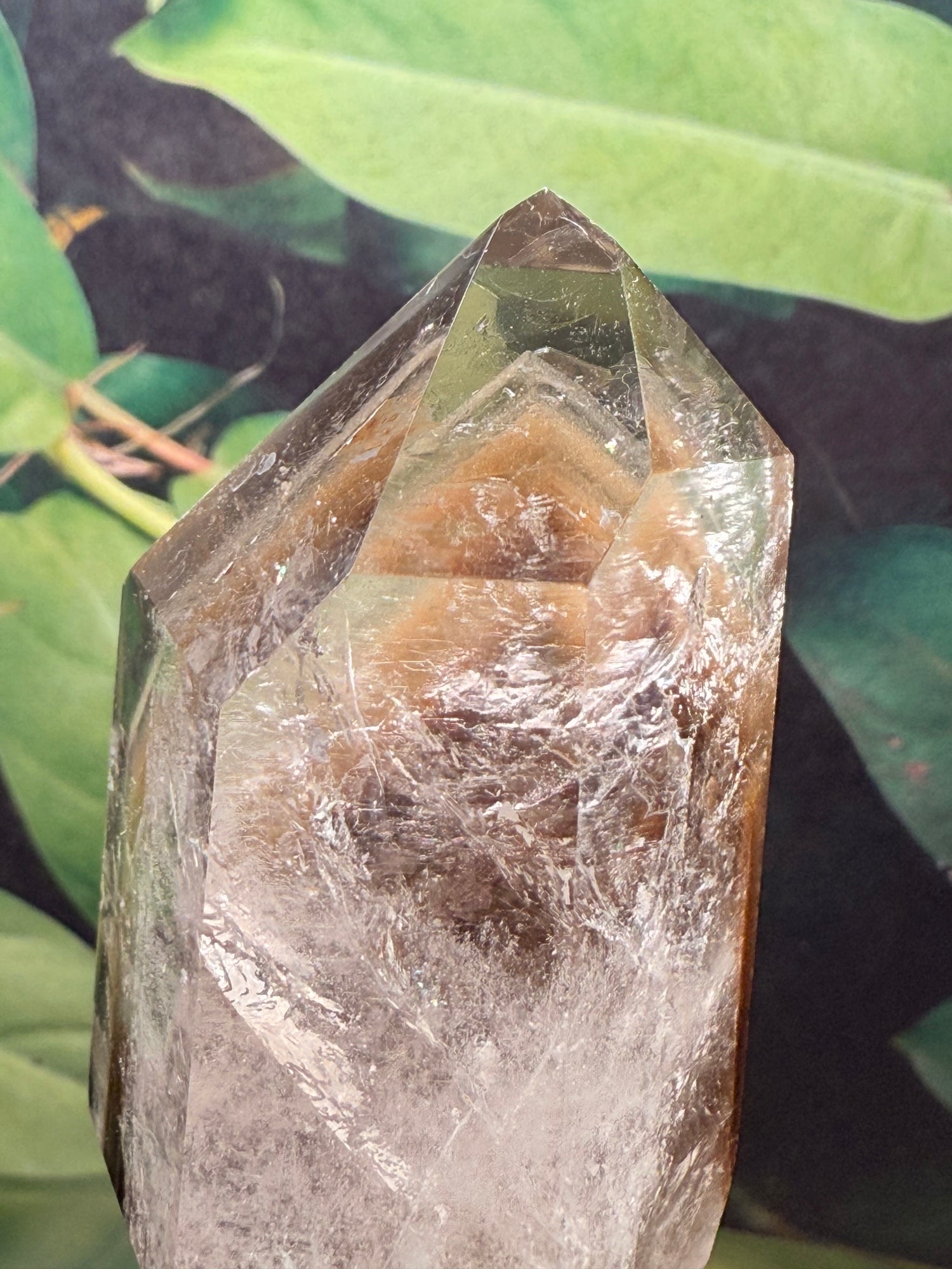 This rare quartz reveals translucent, glass-like clarity while holding deep brown, soil-hued phantoms within — each internal layer capturing a moment in the crystal’s long formation, like sedimented memories of the Earth itself.