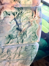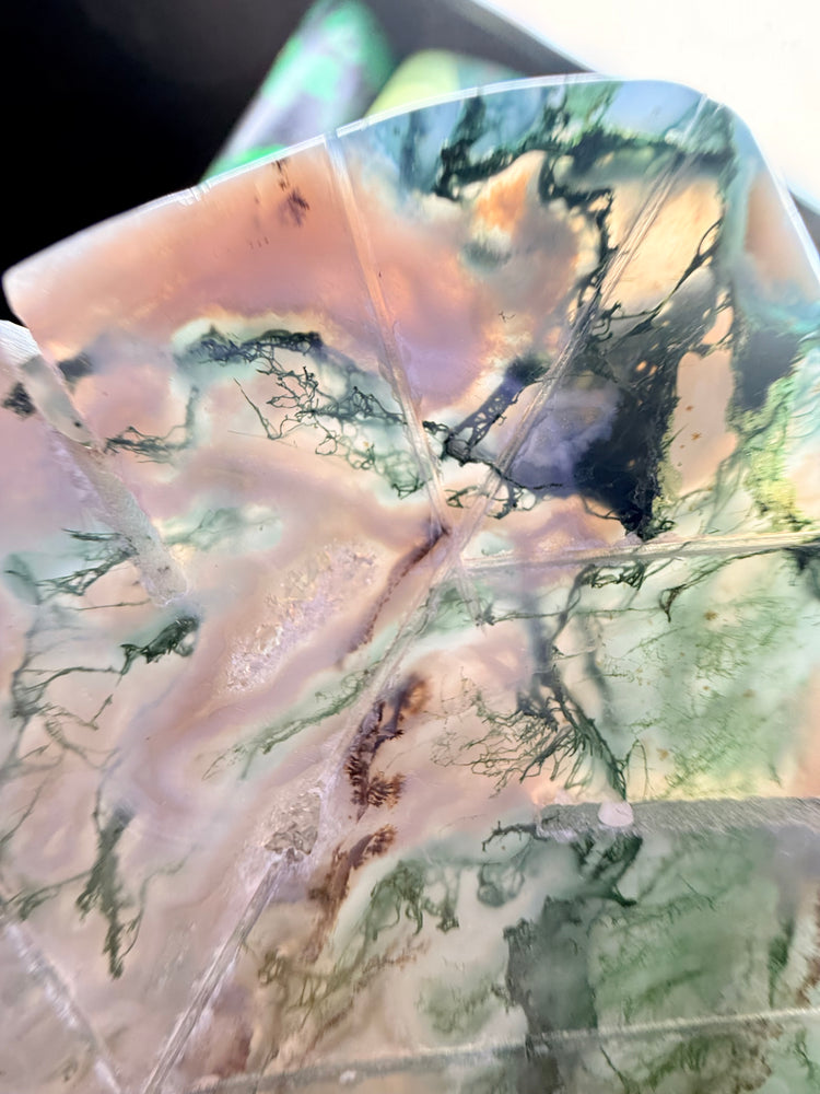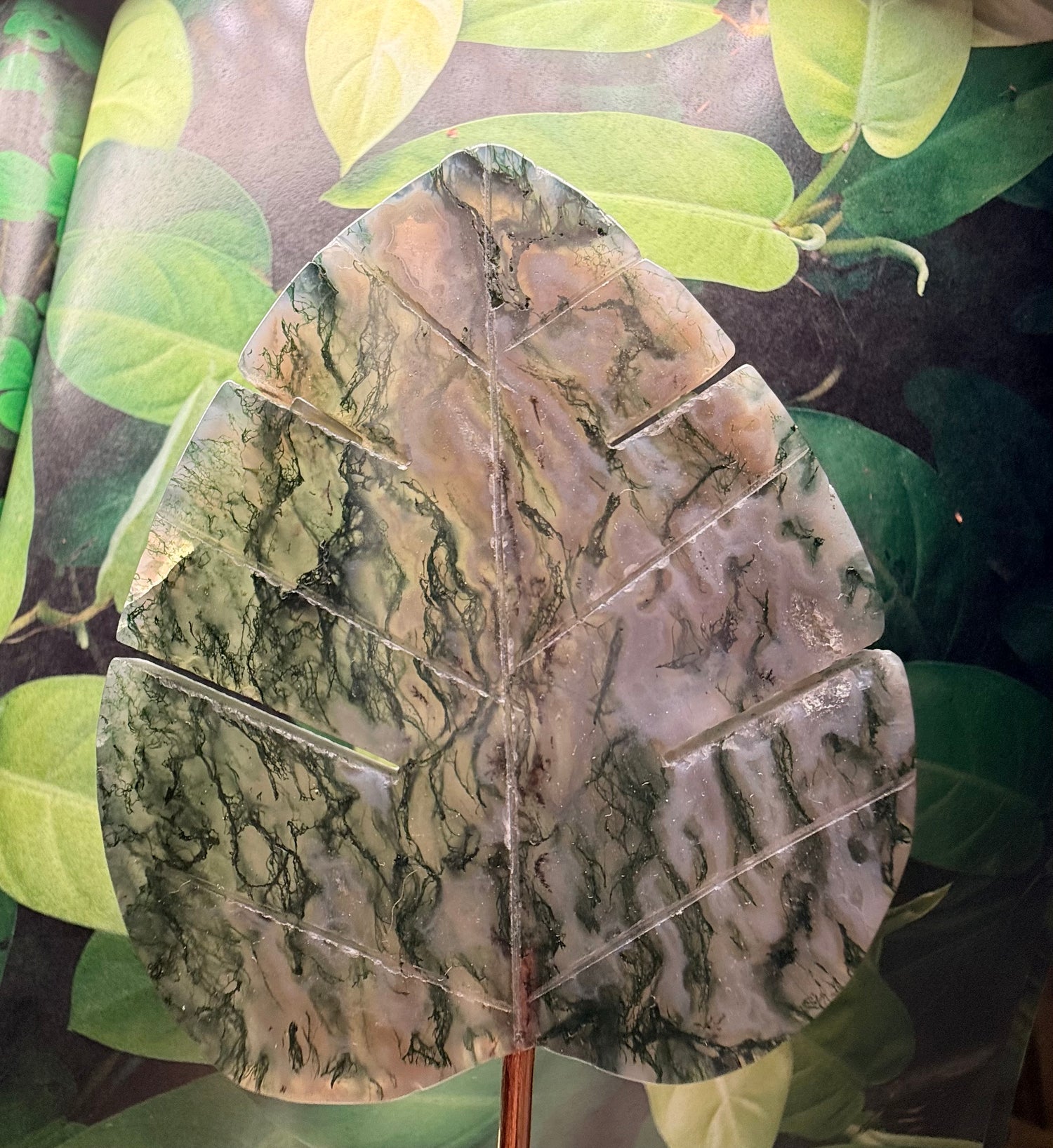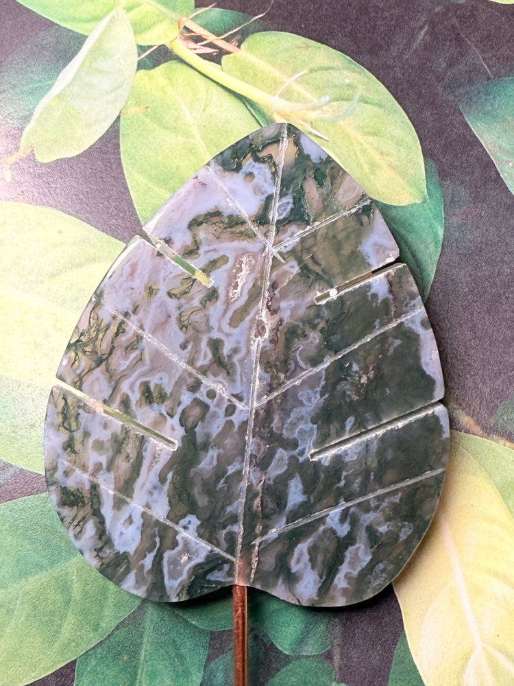 - Natural Moss Agate leaf carving (each one uniquely patterned with moss-like inclusions)