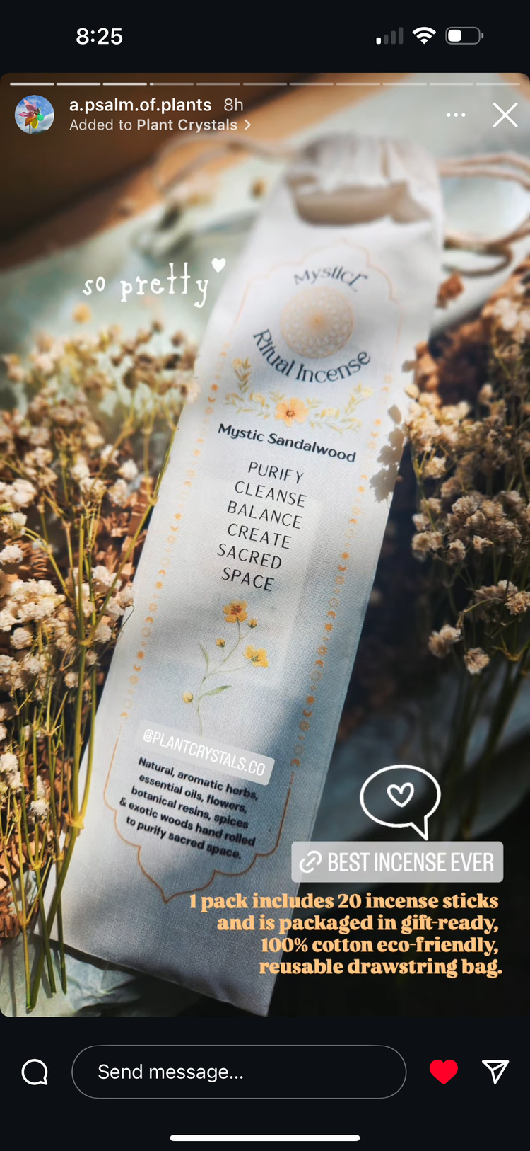 This is a gentle incense that will not overpower your space (or plants or pets!) with intensity but rather perfectly balance and adorn your sacred space or rituals with lite, fragrant bliss of, serenity, grounding, peace, wholeness, energy clearing for you and your Plant Crystals, meditation, yoga, Sadhana practices, healing, tea, or plant medicine sessions, etc.
