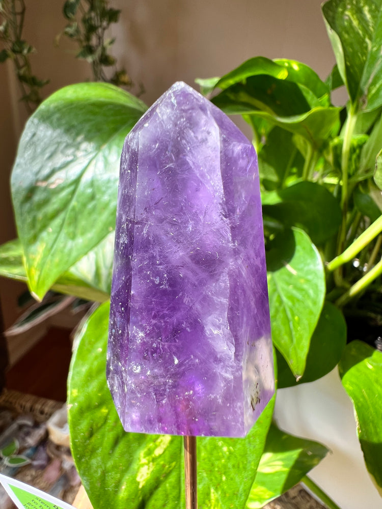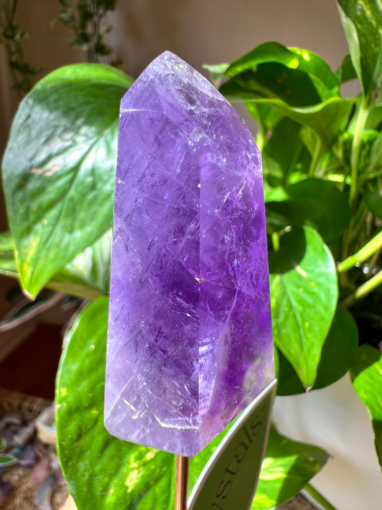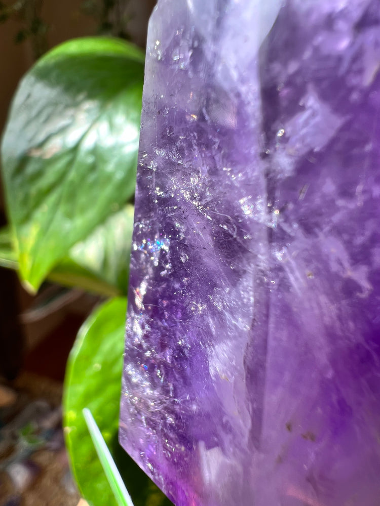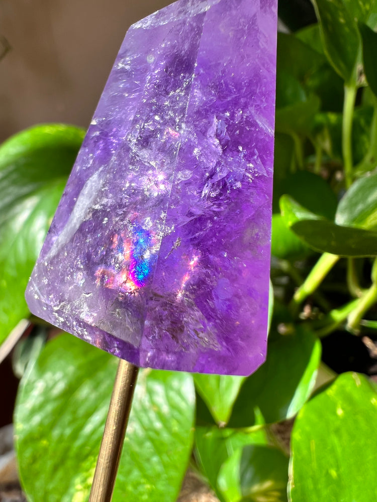 amethyst point with natural symmetry creating a natural pyramid of energy. Has beautiful, natural deep purple colors with natural rainbows!