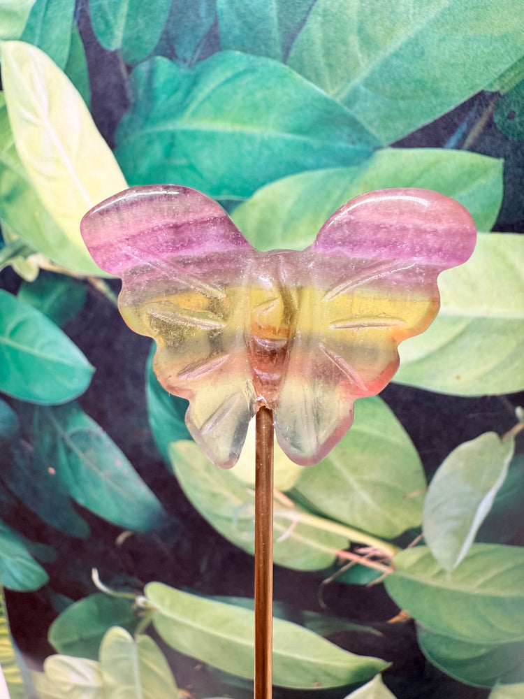 - Mini carved Rainbow Fluorite butterfly (each one uniquely banded in natural hues)