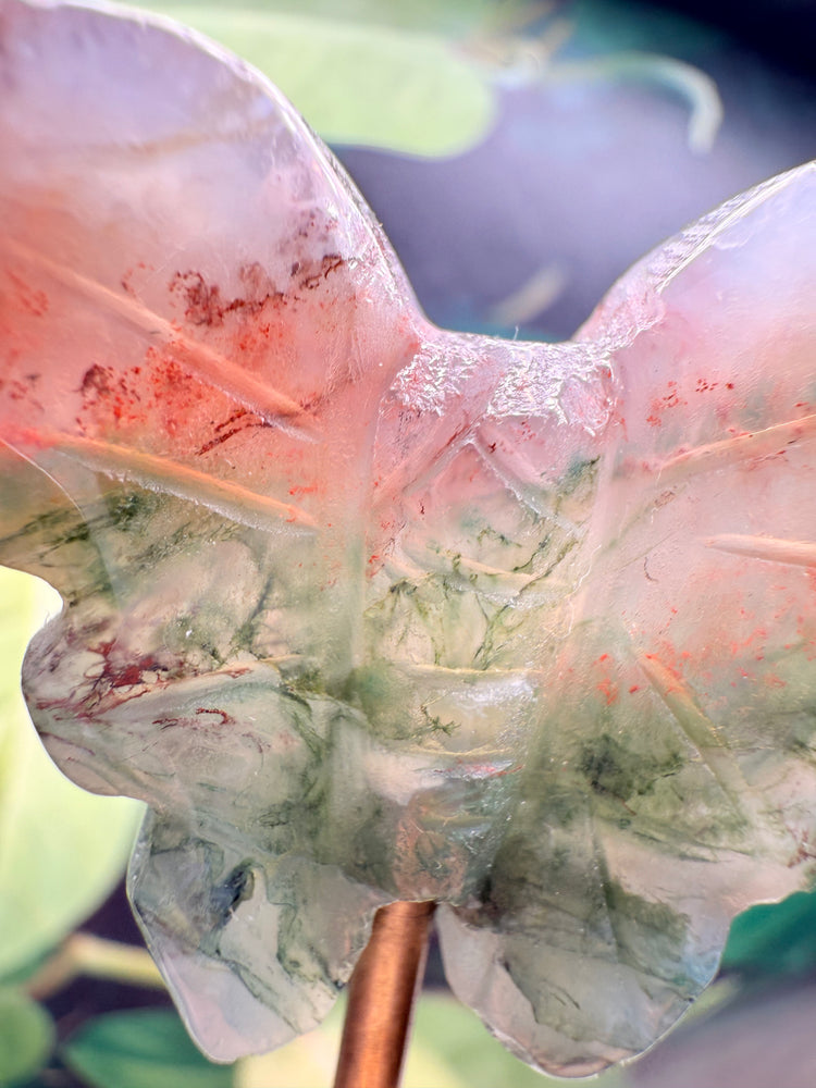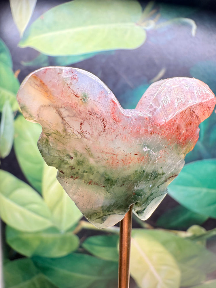 Soft, grounding, and alive with forest-like beauty, our Moss Agate Butterfly Plant Crystal carries the energy of renewal, balance, and deep connection to nature.