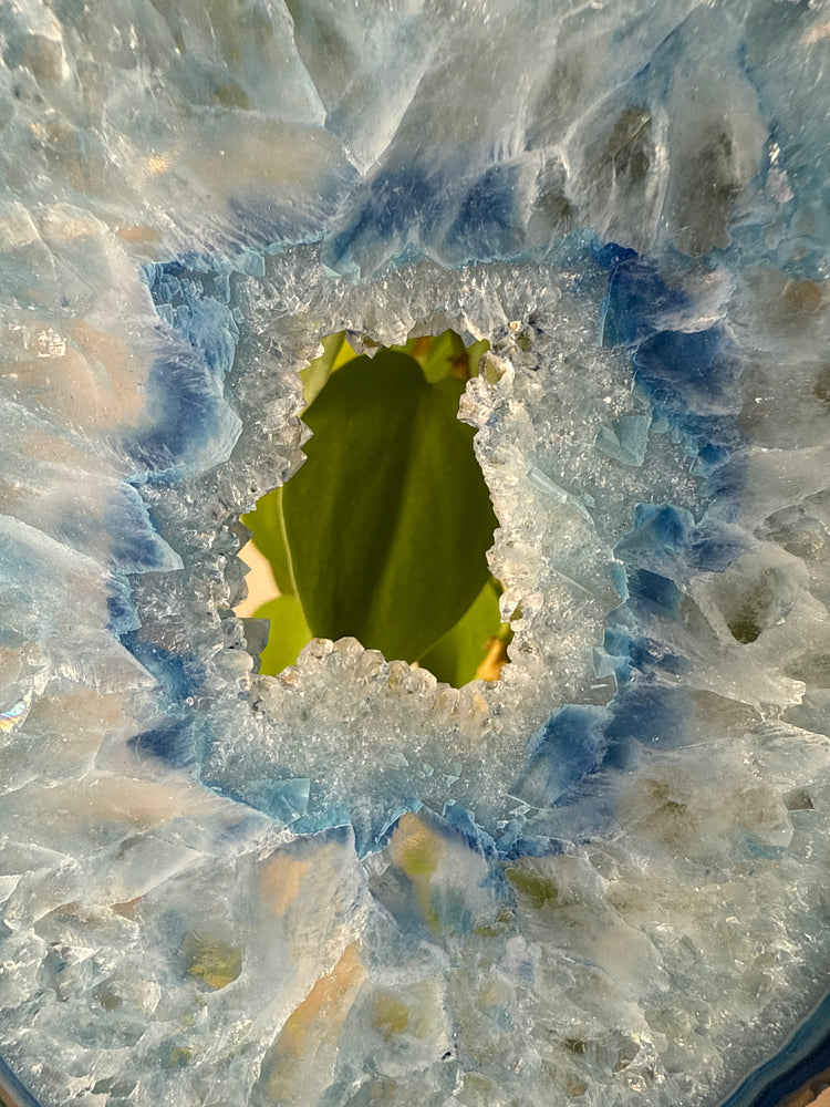 Large agate with beautiful, high quality blue quartz portal. Natural, raw and earthy.