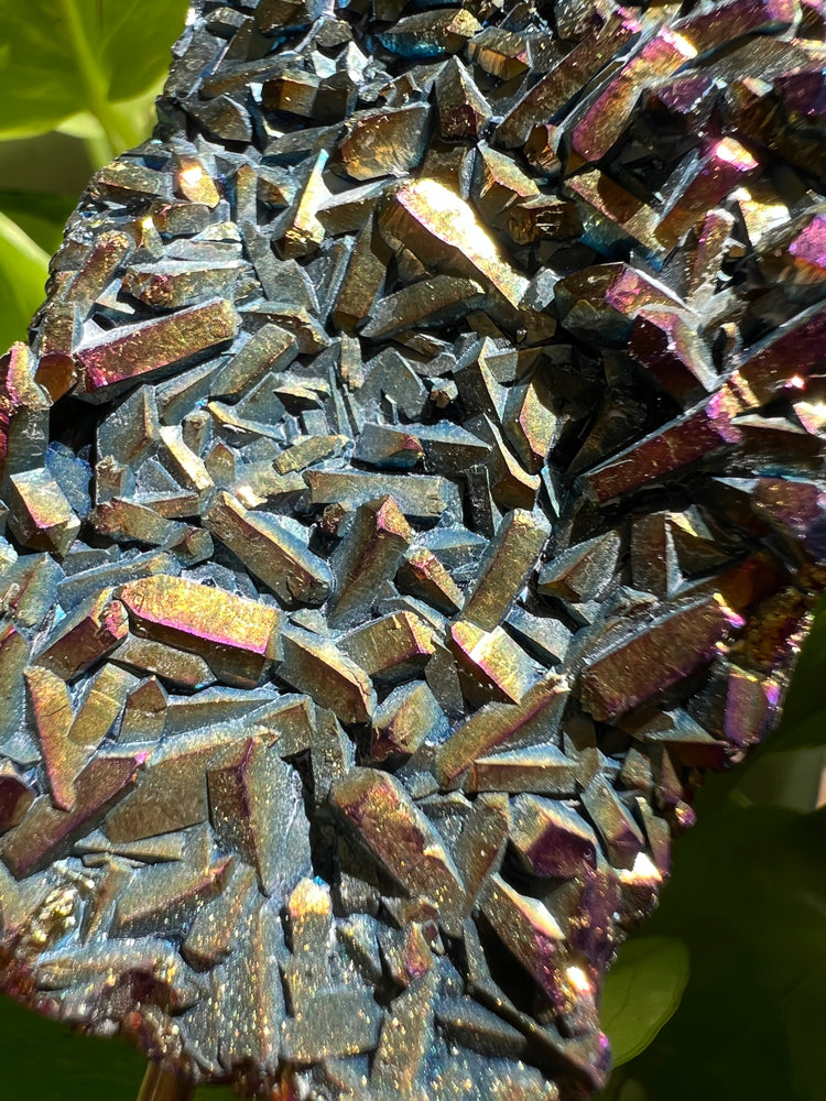 RARE* chunky rainbow titanium slab with unique grown pattern of large needle points growing all over. Light, bright and beautiful energy, has incredibly magical rainbows allllll over the entire crystal. Will give a disco ball effect when sun hits it