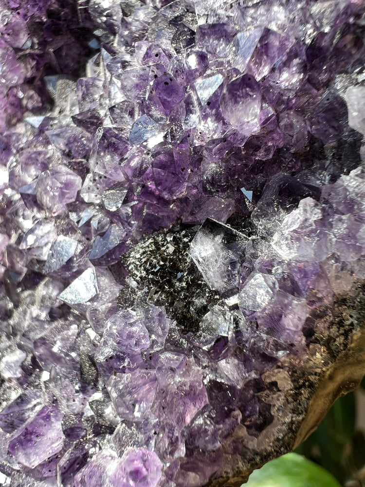 Very Large lavender Amethyst with TONS of large amethyst points all over as well as a giant calcite egg growing perfectly off the shelf of the crystal. A very rare piece💜✨