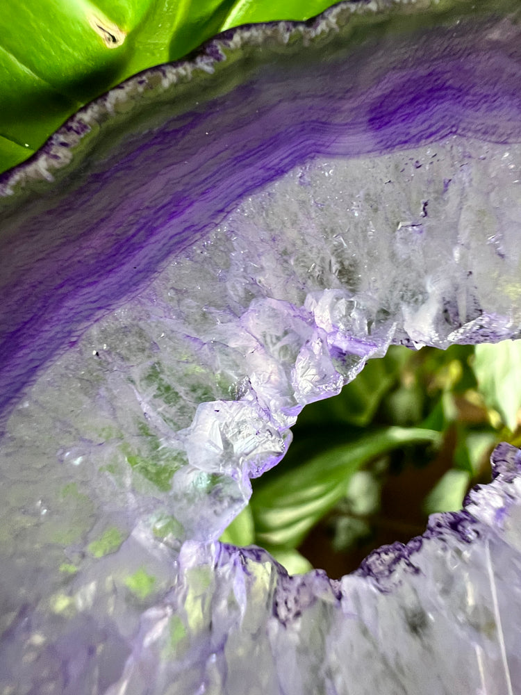 Purple Agate Plant Crystal with beautiful lacing detail and quartz portal. Portals represent entering through new doorways, timelines and dimensions. This agate will illuminate & change colors in sunlight
