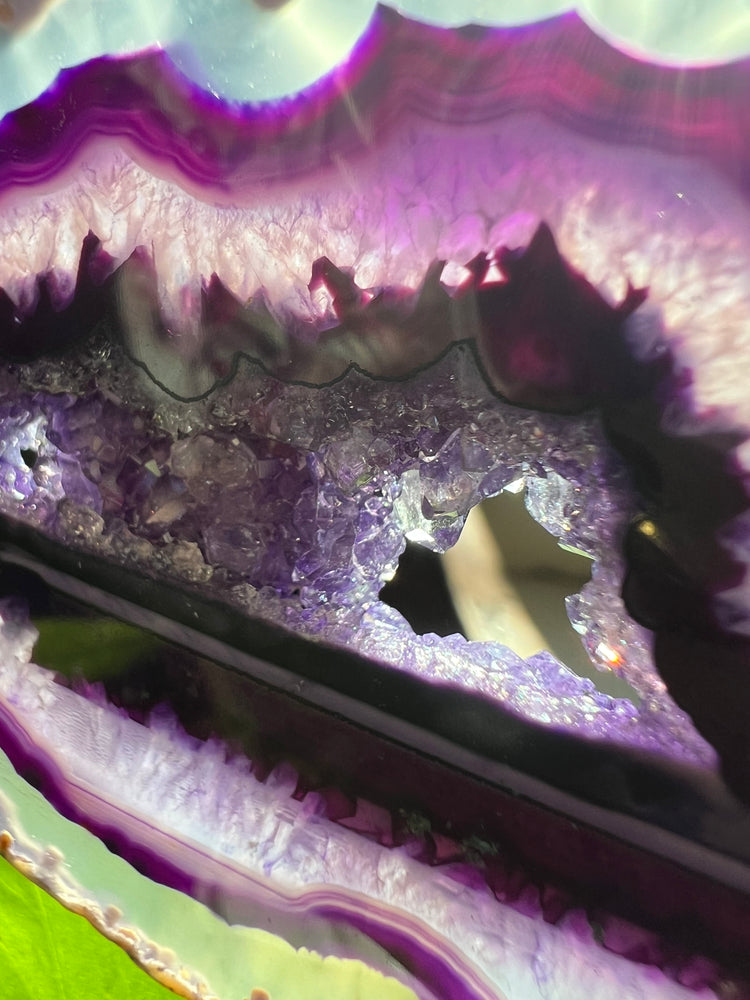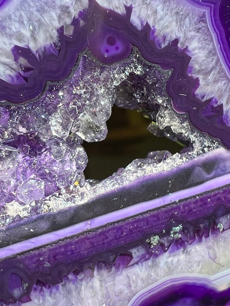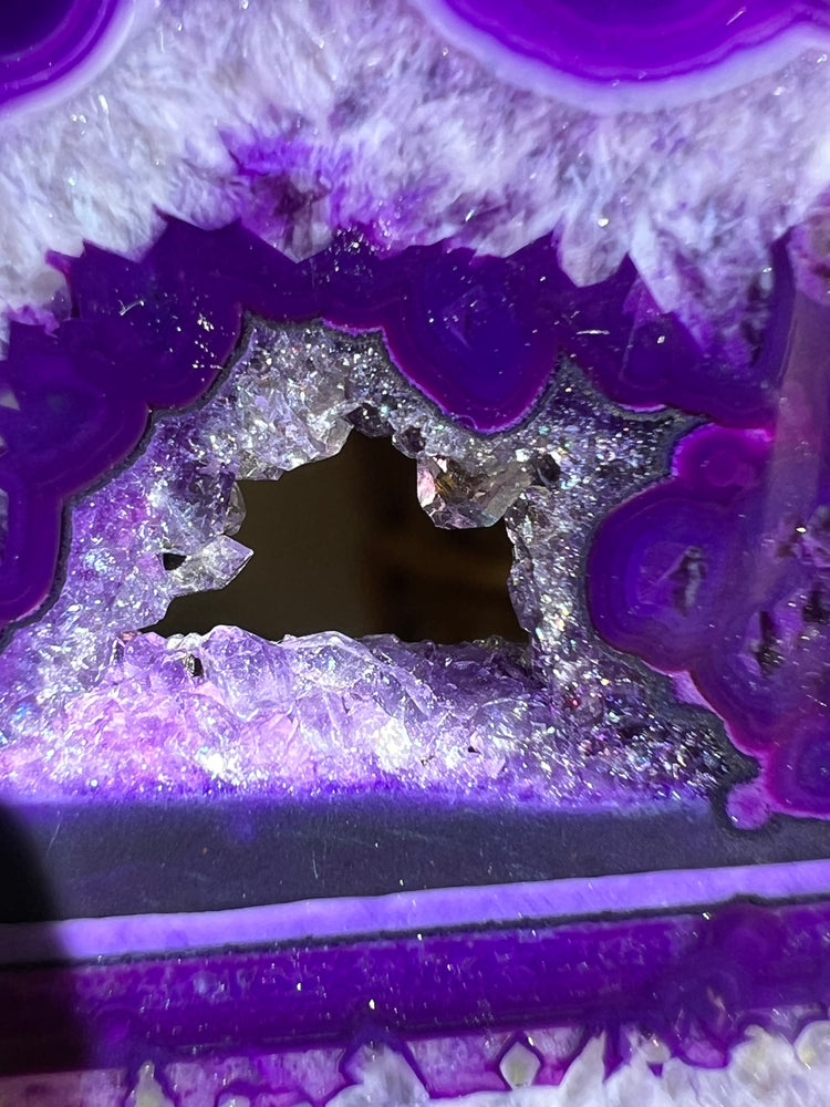 Purple agate with so Much intricate dimension. It tells a start from every angle. Including a high quality gemmy portal with tons of sparkle. Will also glow beautifully and change colors in natural sunlight!