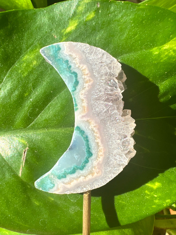 🌙 1 of 1. Rare pink amethyst moon with teal lacing detail and natural rainbow inclusions. It also glows when sun goes through it!