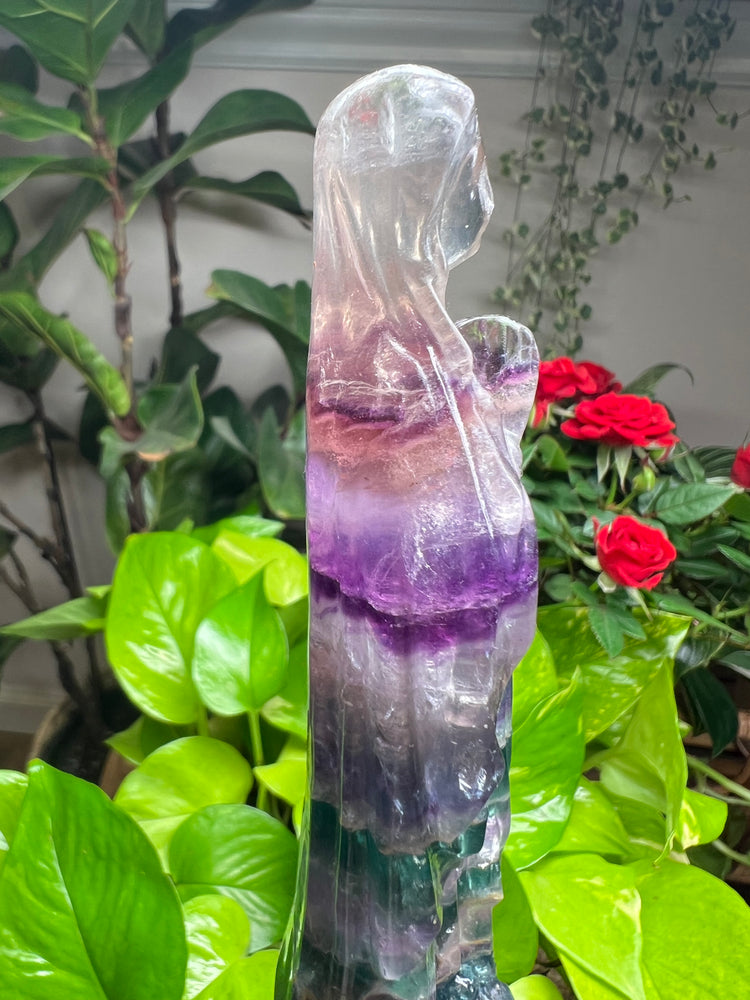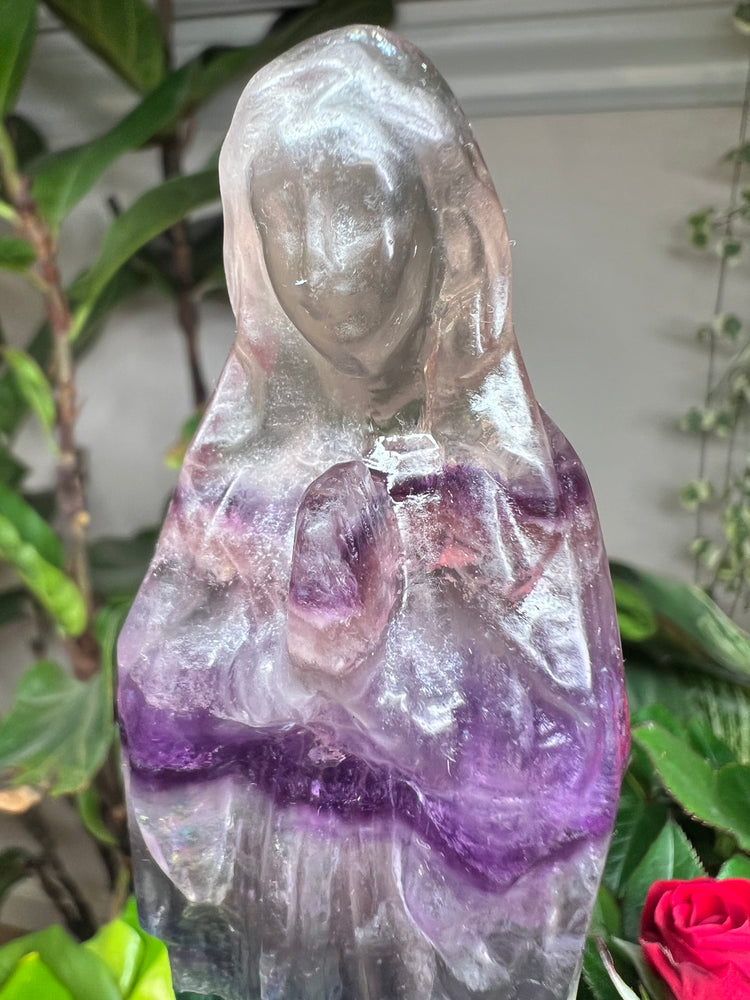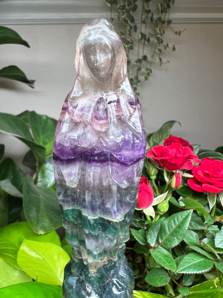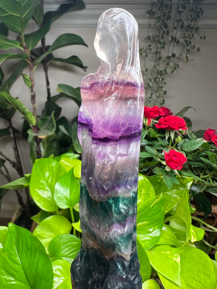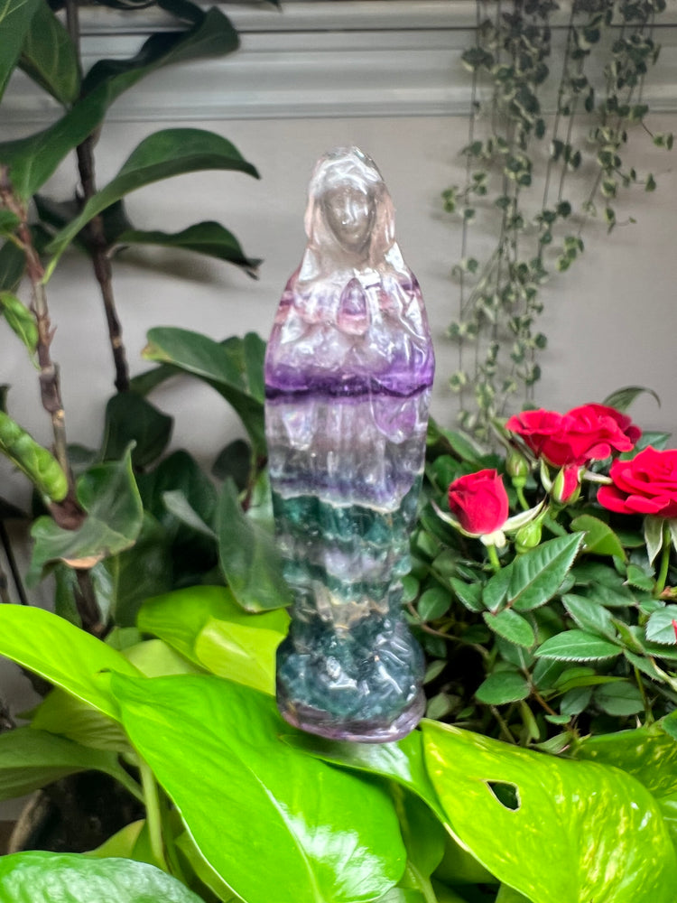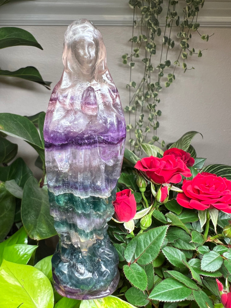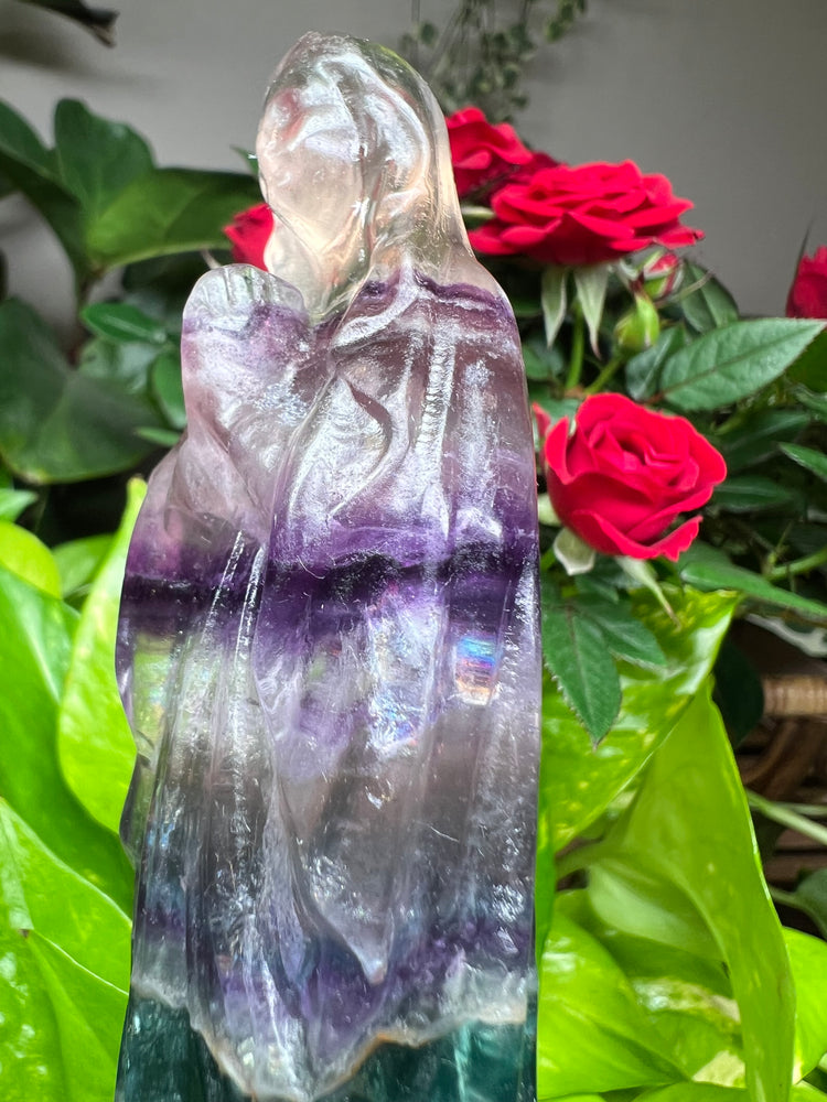 Rare* Only one available. Large Mother Mary in rainbow Fluorite with natural rainbow inclusions.