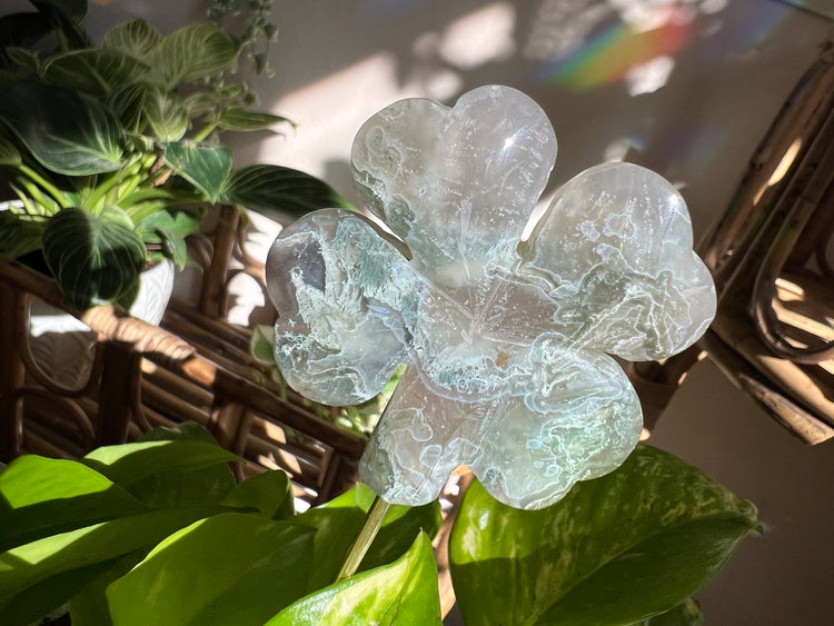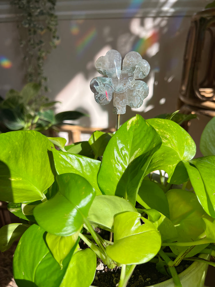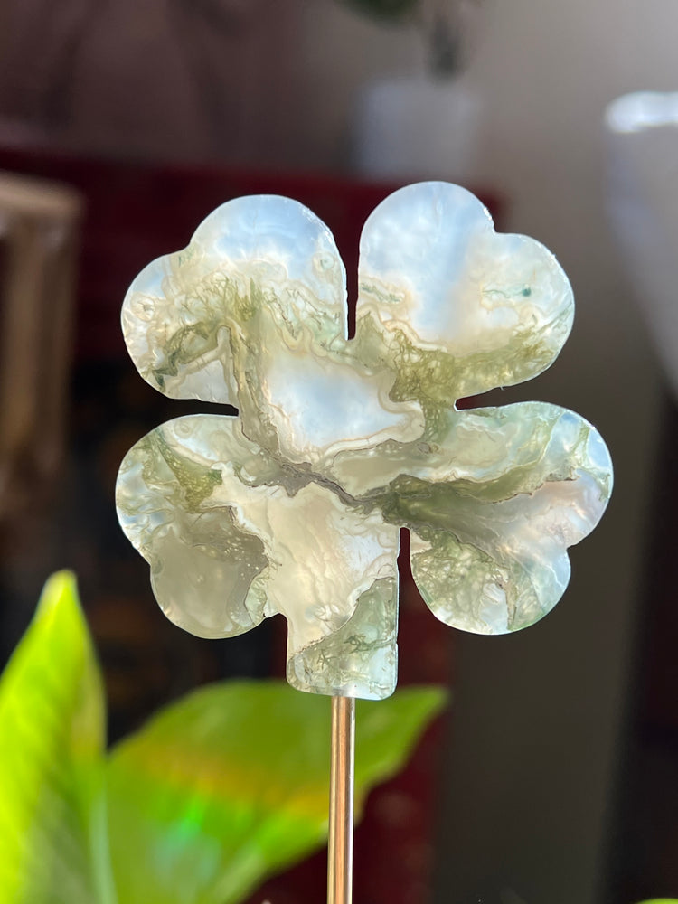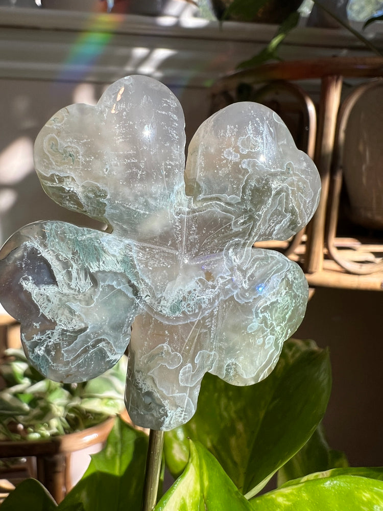 Large four leaf clover with heart leaves. This piece also glows & changes color in sunlight.