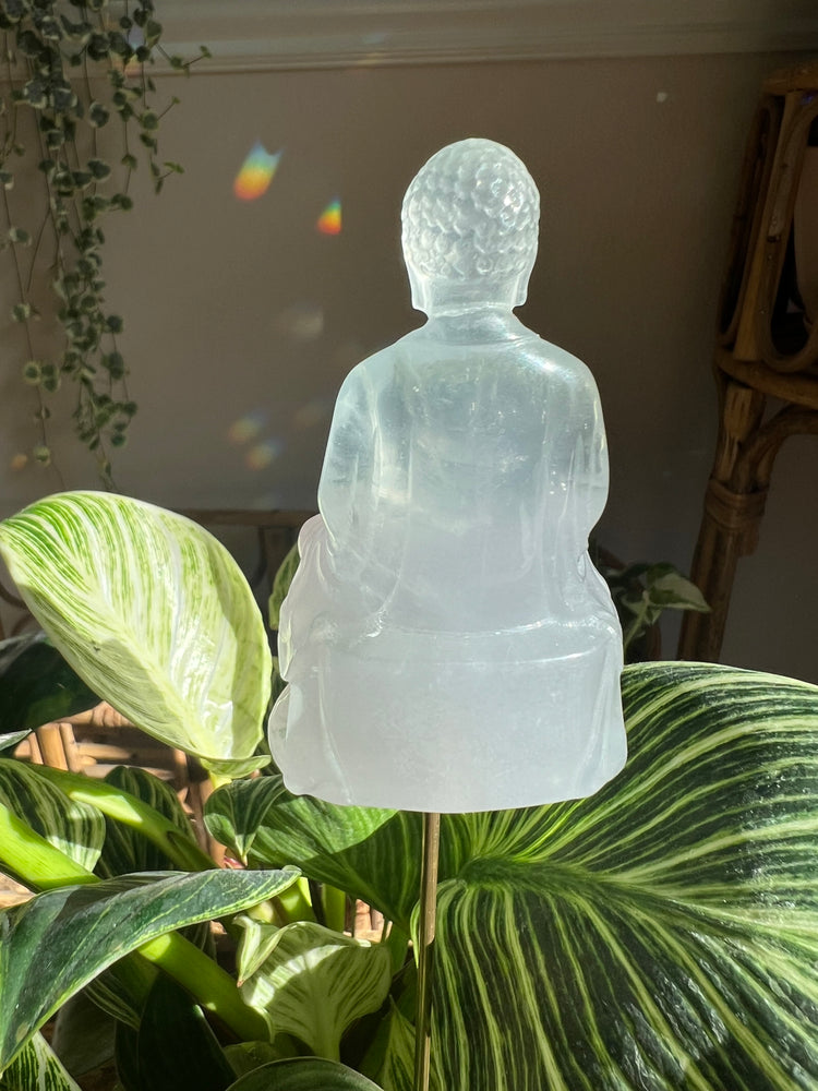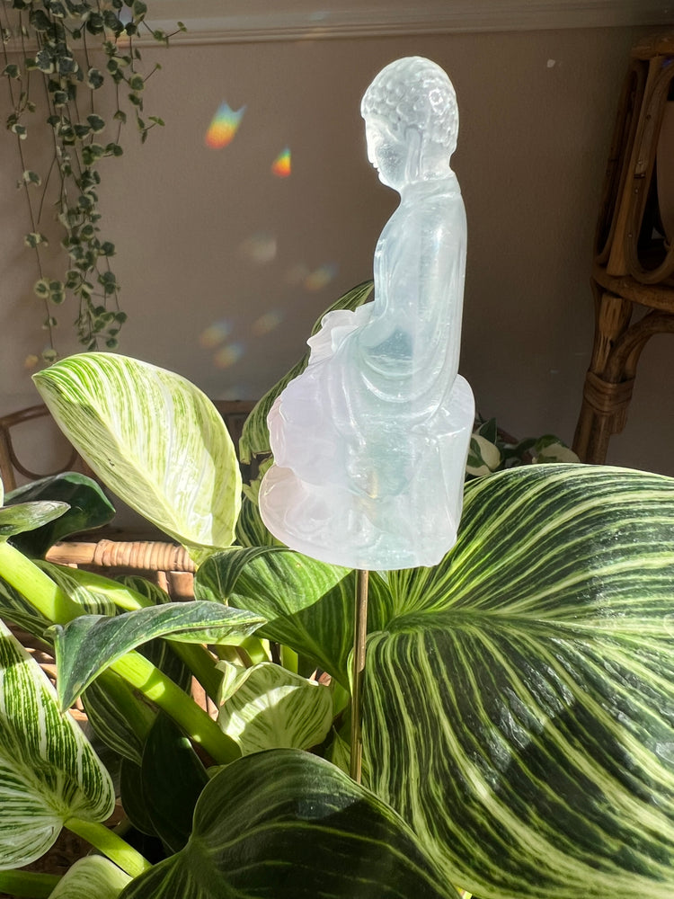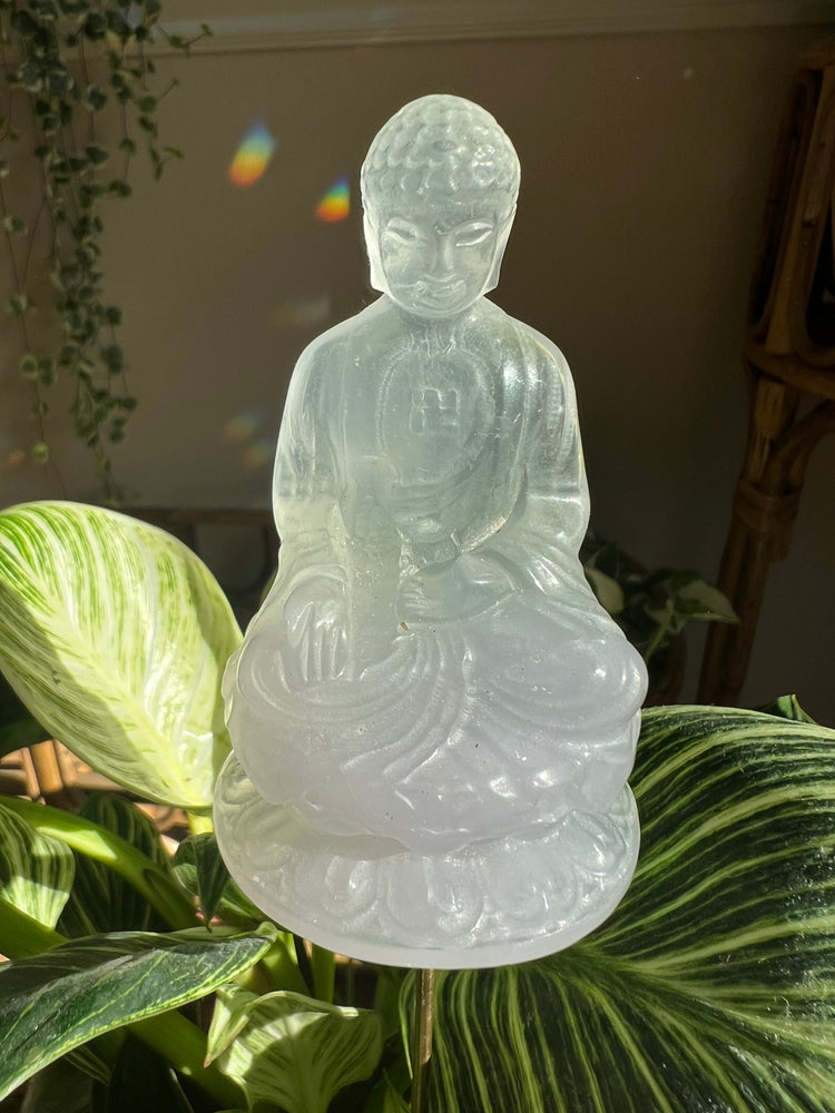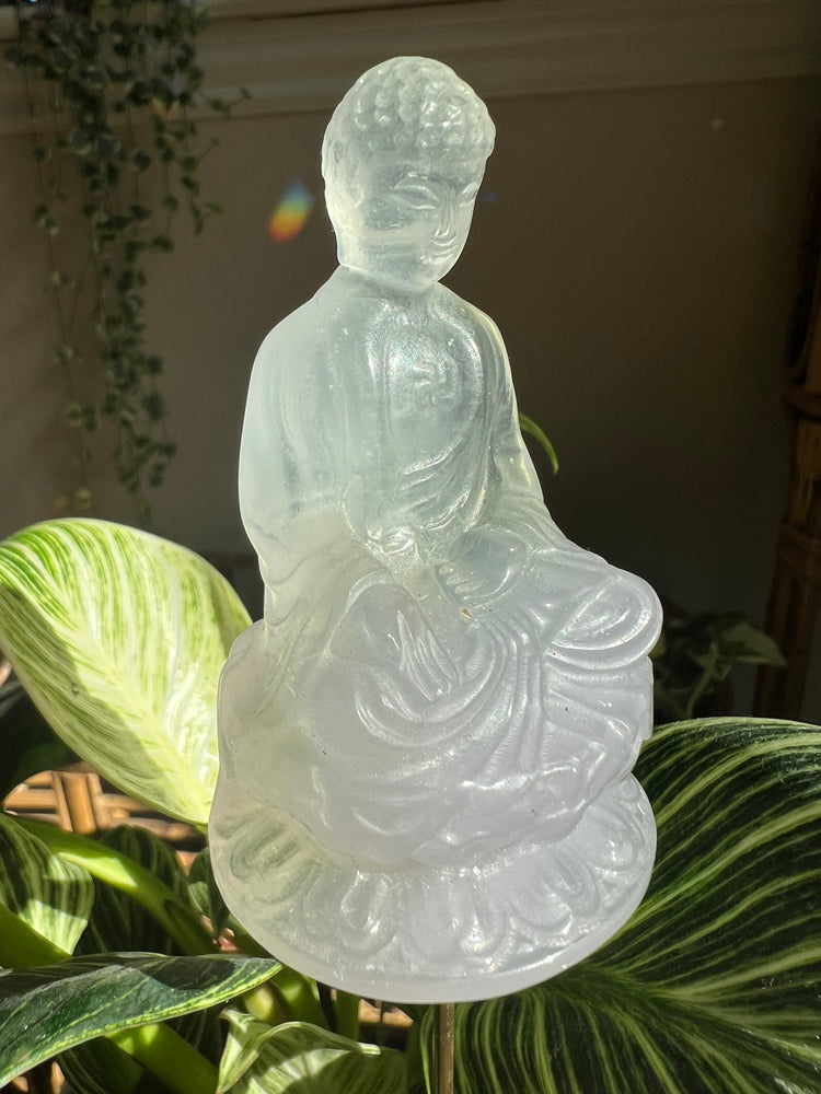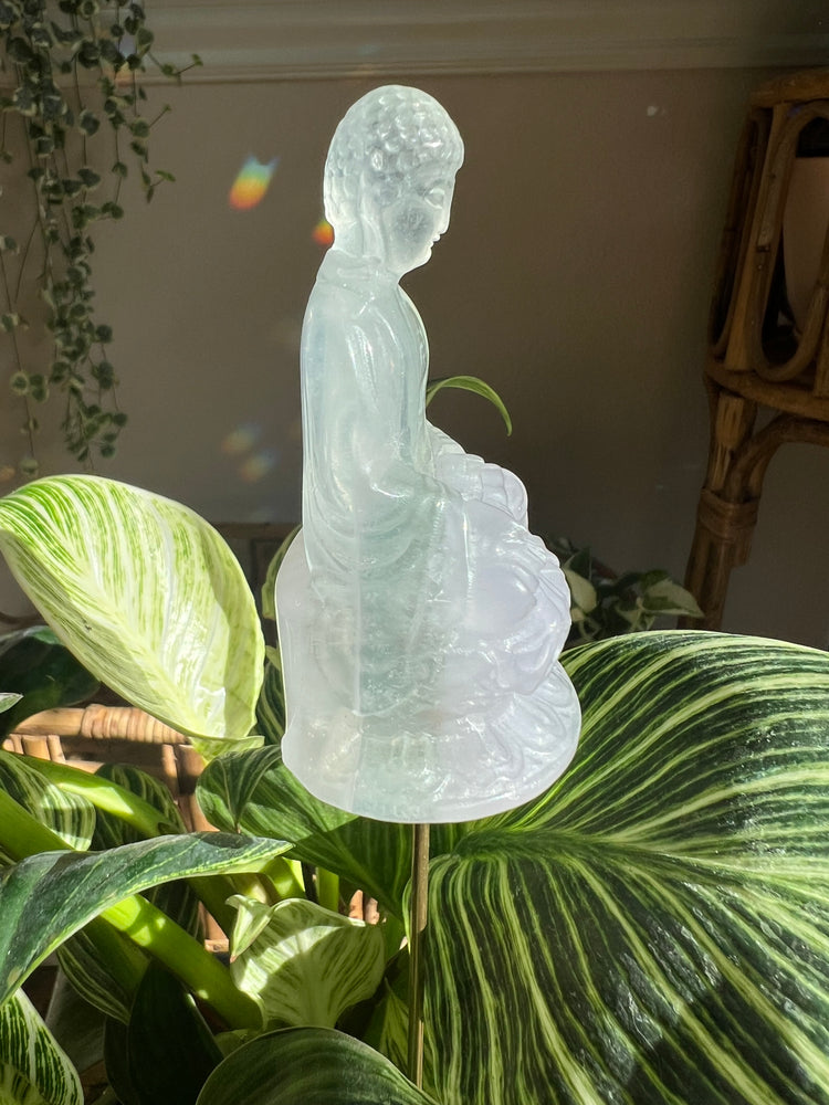 protective energy with this large flurorite Buddha in lotus carving. Calls in peaceful, calm energy to your space always. Would look beautiful in an outdoor garden as well.