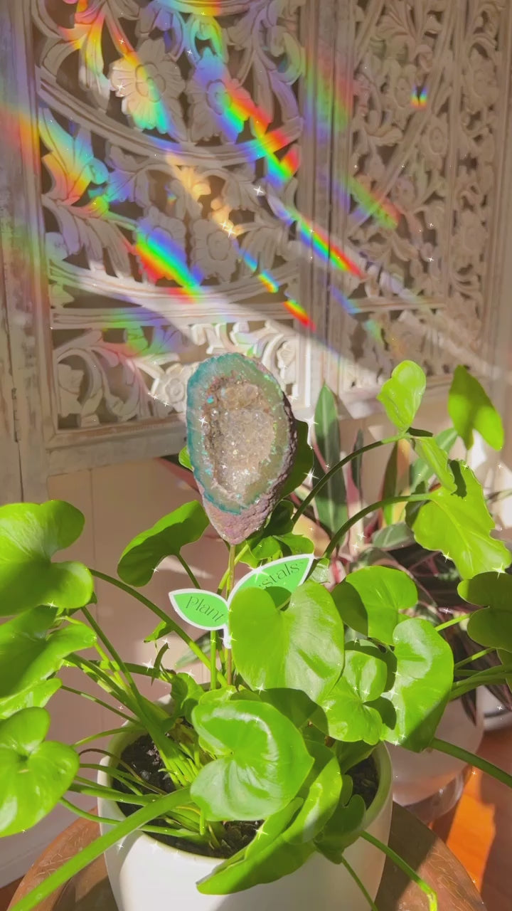 An Incredibly rare and special opportunity to create an altar in your home using a Plant Crystal. This angel aura geode has a large cave full of brilliant multi-colored Quartz points.