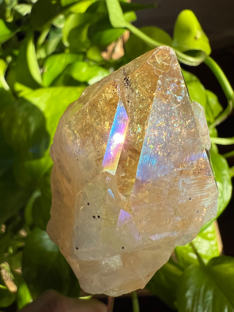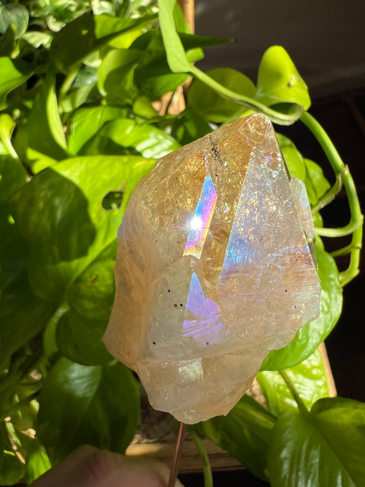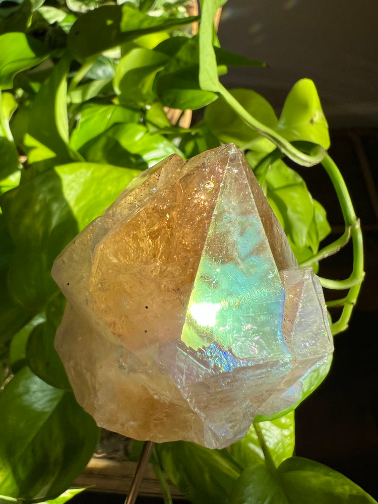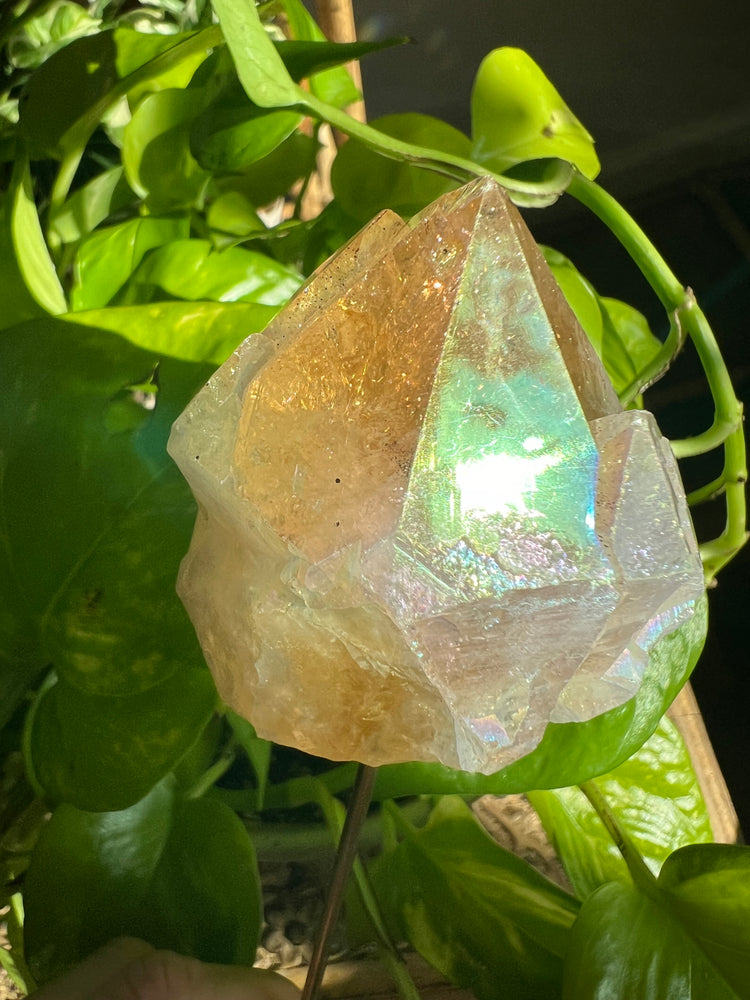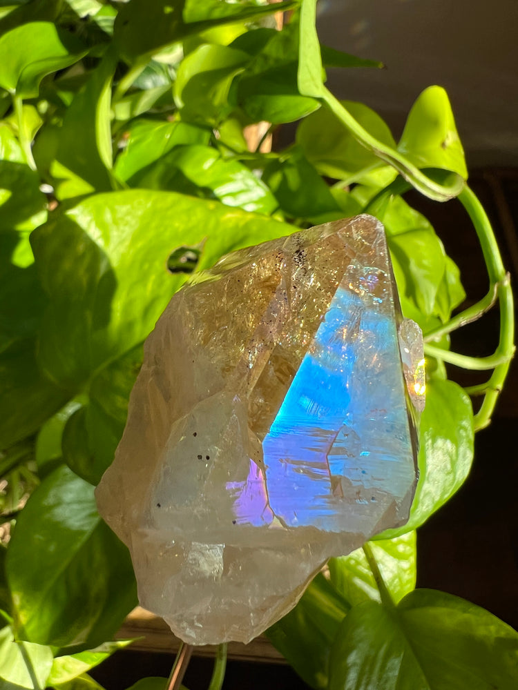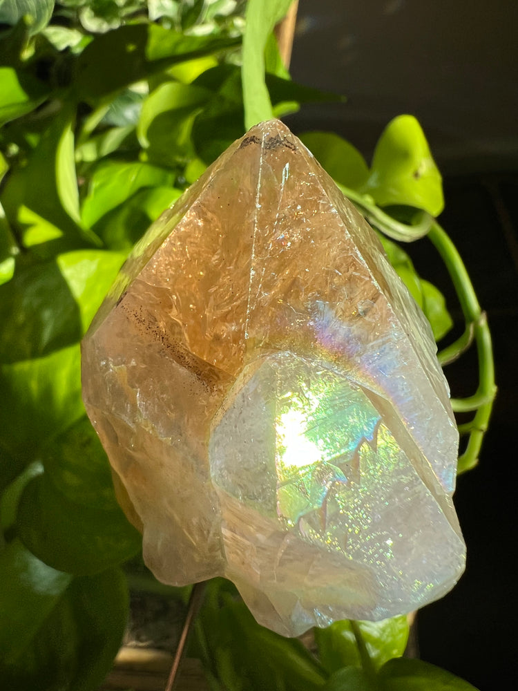 Large, angel aura citrine triple point that rises into one large point. Beautiful pastel rainbow shimmer covers this entire crystal bringing joyful energy to all who gaze upon it.