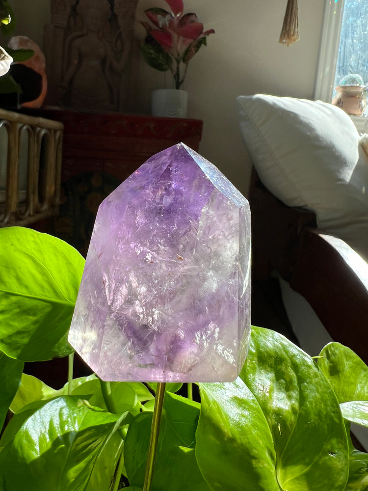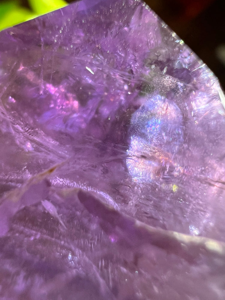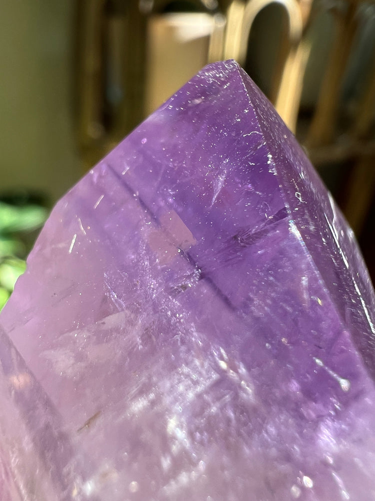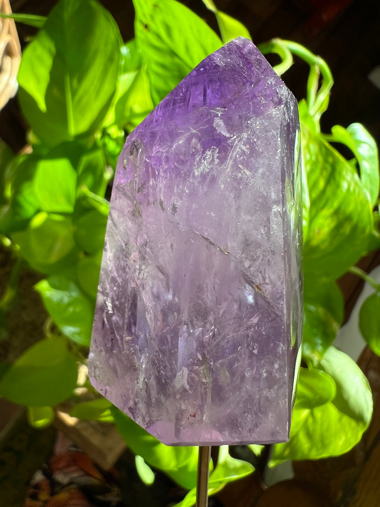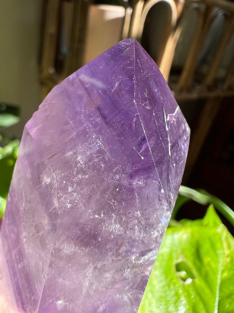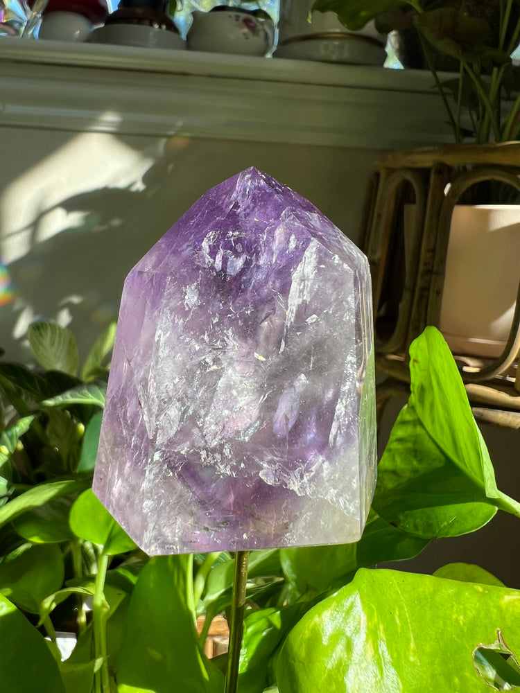 Large Amethyst polished tower with a beautiful variety of purples from light to dark. One side of this crystal is covered in natural rainbow inclusions. Powerful stone that’s sure to bring peaceful, calm energy to your space.