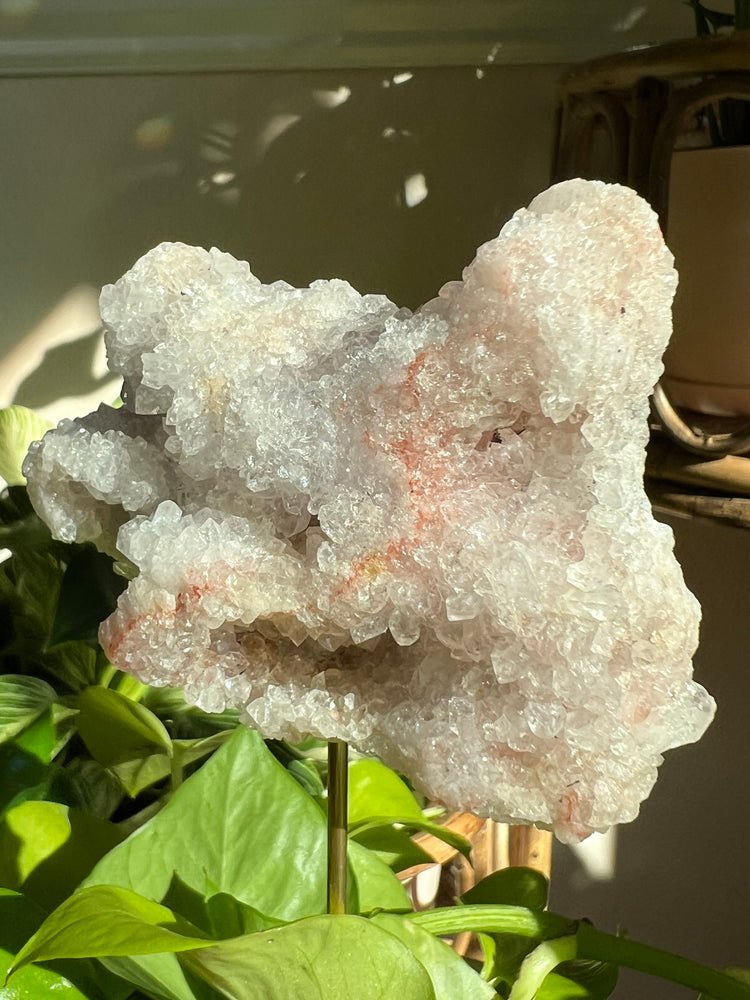 Large, raw and earthy pink amethyst geode with tons of pink quartz points allll over it! Exceptional sparkle and shimmer all over! pretty light pink color.
