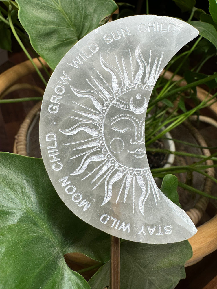Large and thick 4 inch Selenite Moon with a beautiful mantra to keep you inspired. Selenite is known to be a wonderful crystal for cleansing spaces, crystals and energies.