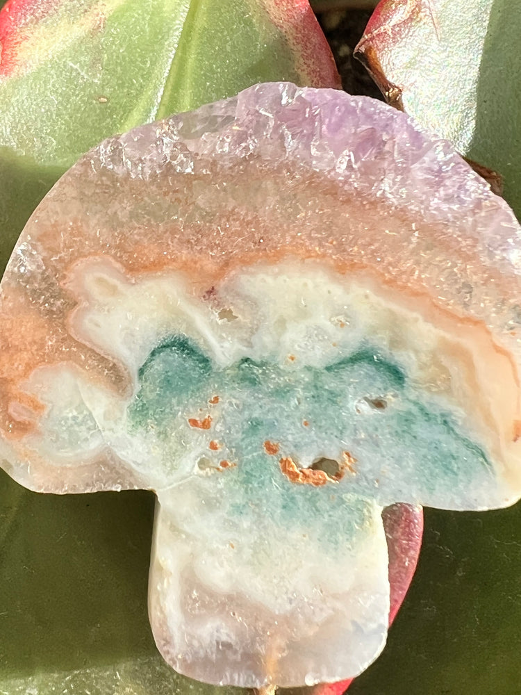 A very HAPPY lil pink amethyst mushroom for your plant or flower collection. Look closely, it has a happy, natural smile.😌 this is one of the most beautiful Plant Crystal mushrooms we’ve ever gotten, beautiful peachy, teal, purple combo of delightful colors. Your plants will be so happy just like this little fungi!