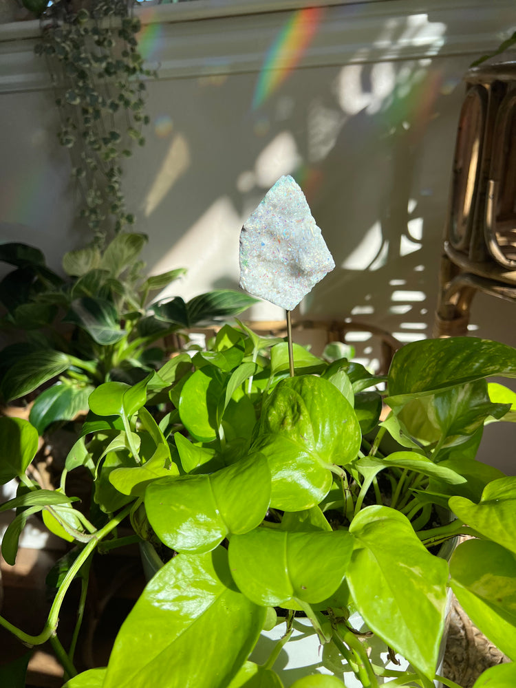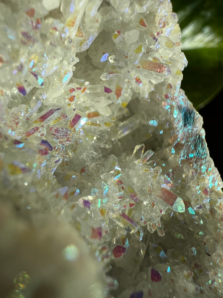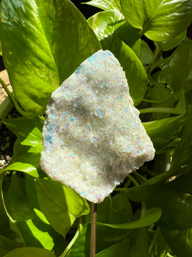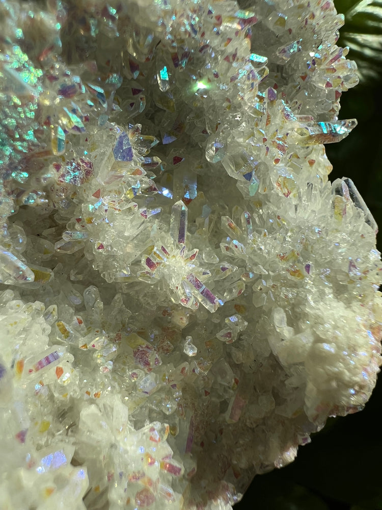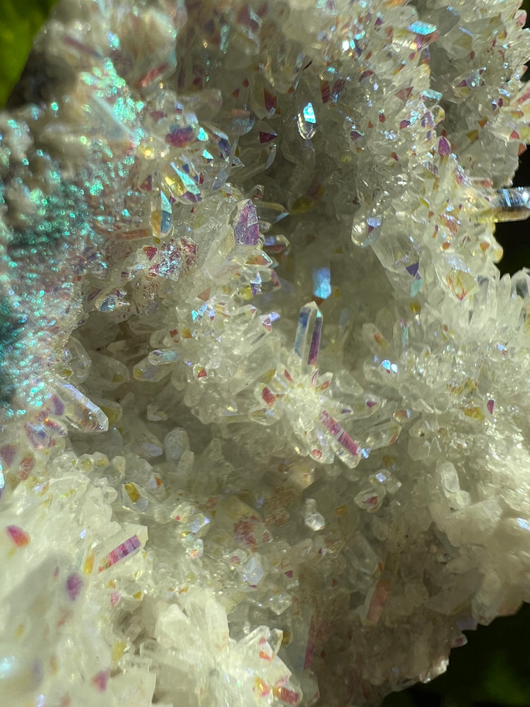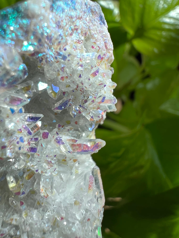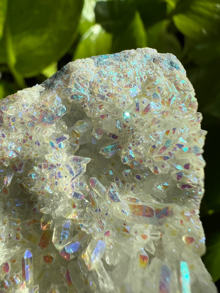 RARE* this angel aura Plant Crystal is incredibly special for its unique crystal growth pattern. It has a mixture of small drusy quartz and long, needle quartz clusters all mixed together in this breathtaking piece. Light, bright and beautiful energy, has incredibly magical rainbows allllll over the entire crystal.