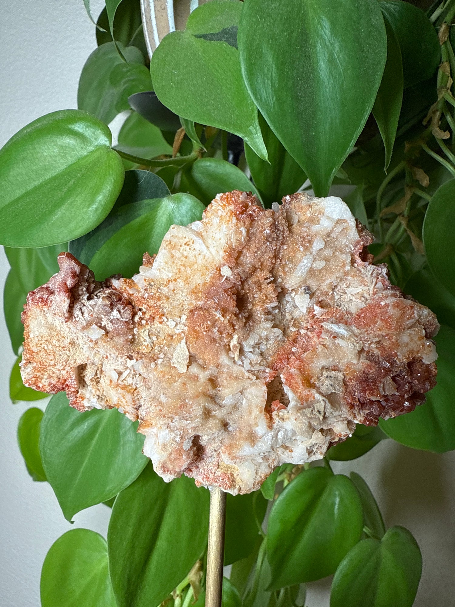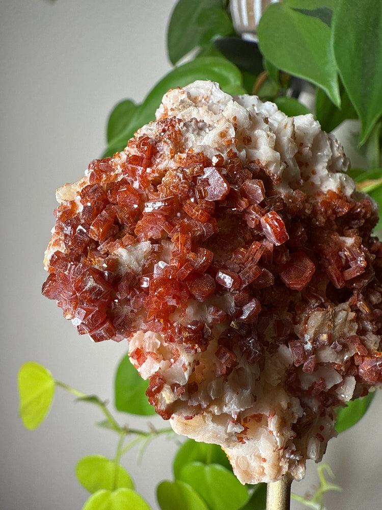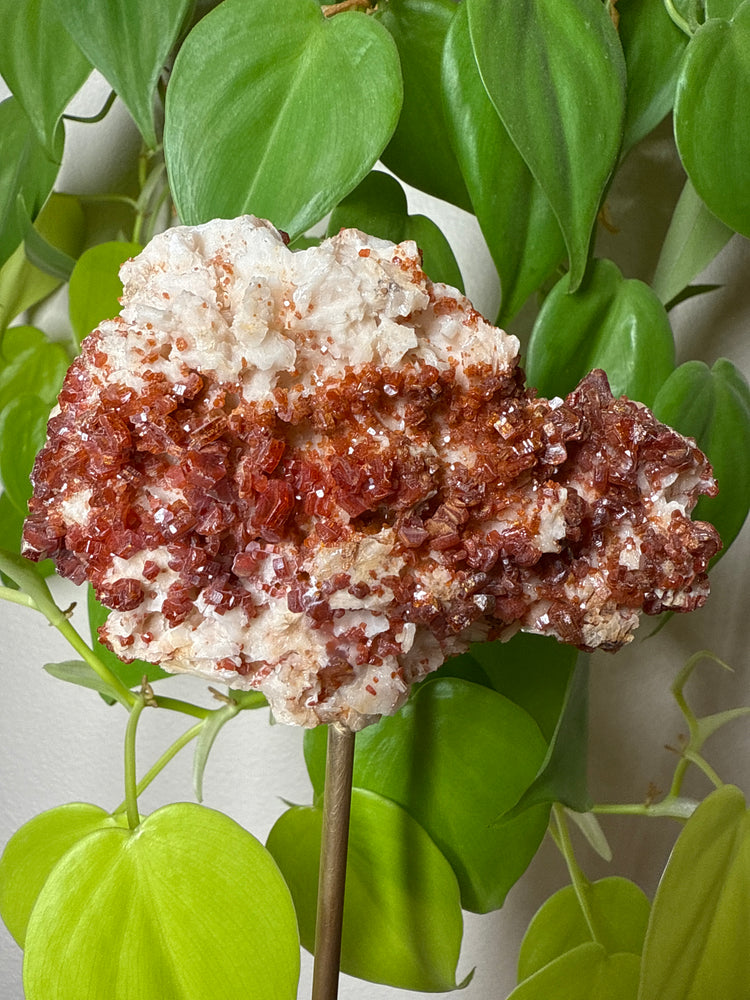 Place Vanadinite on Barite in your home, sacred space and in your plants to infuse your environment with enlivening warmth, focus, and clarity. Its vivid formation supports biophilic design by bringing the raw, untamed beauty of the Earth directly into your daily rituals, connecting you to the elemental forces of fire and earth.
