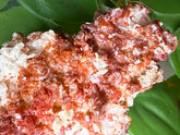 Vanadinite on Barite raw crystal formation is a radiant mineral with mega drusy sparkle and shimmer that embodies grounded fire and embodied inspiration. Fiery vanadinite crystals grow in vibrant red, hexagonal clusters atop soft, grounding barite blades—creating a natural harmony of stability and creative ignition.