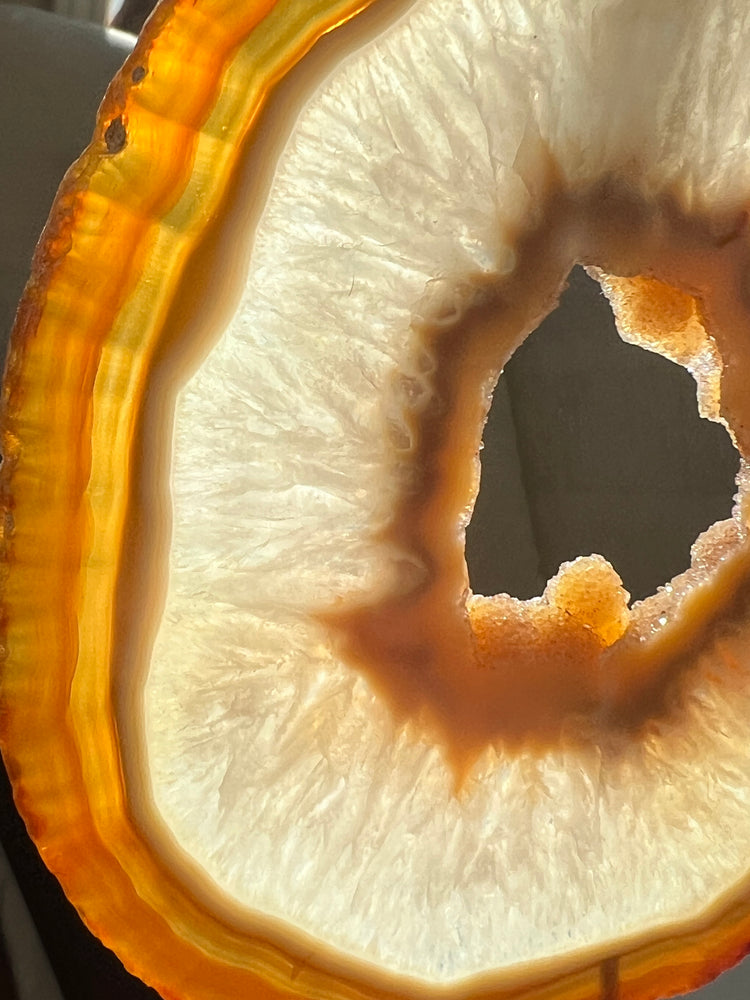 Very large natural agate with stunning colors and a super sparkly, drusy portal.