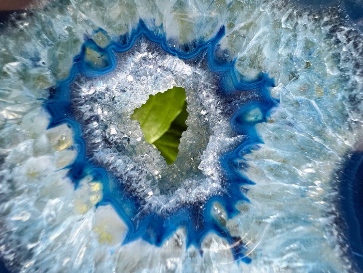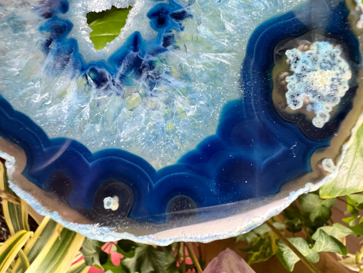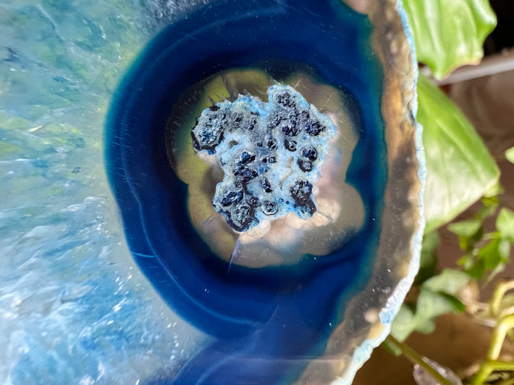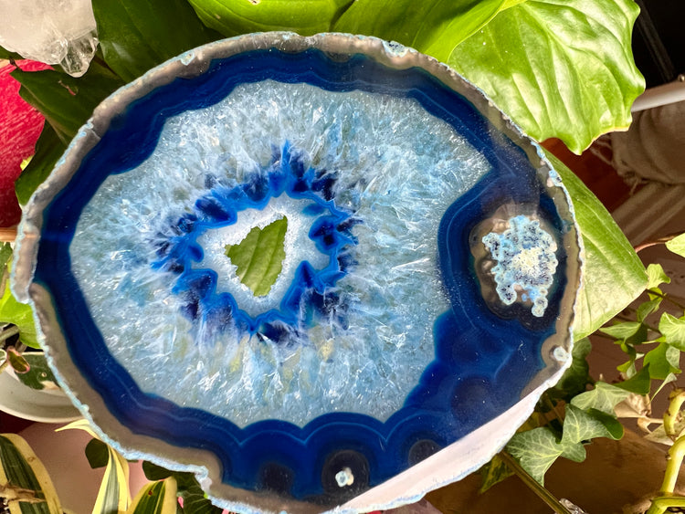 Blue Agate Plant Crystal with beautiful portal. Portals represent entering through new doorways, timelines and dimensions. This agate will illuminate & change colors in sunlight