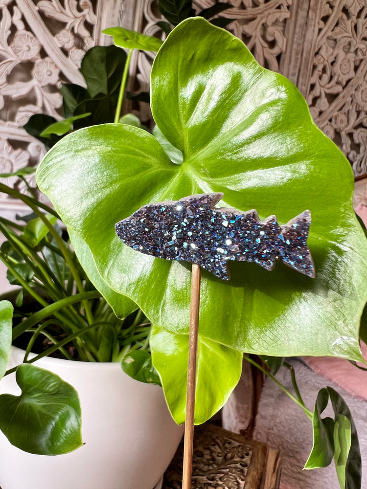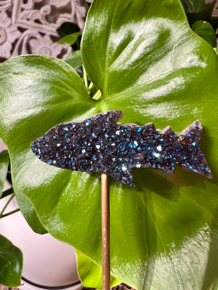 For the shark lovers, a rainbow titanium coated shark carved Plant Crystal with beautiful and super sparkly blue colors.