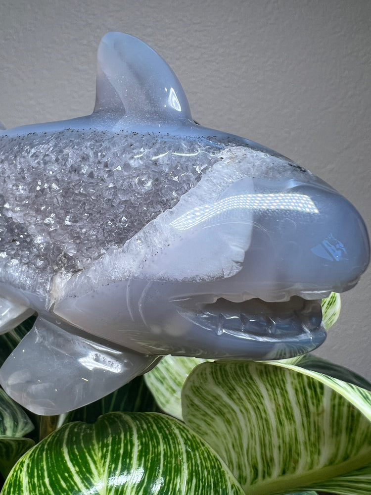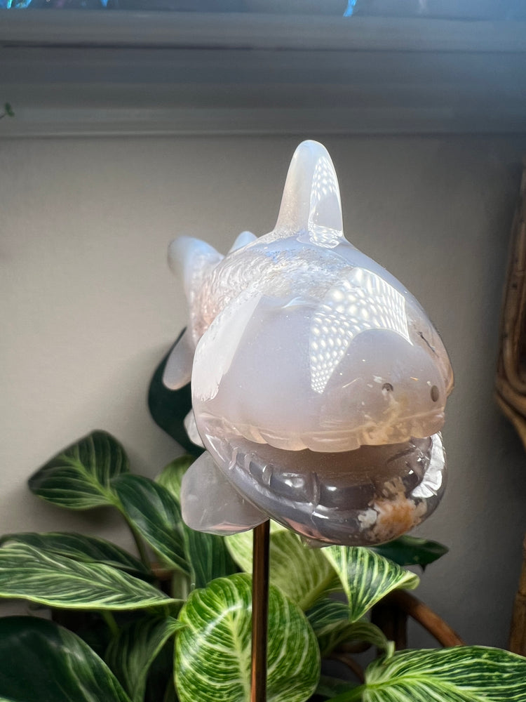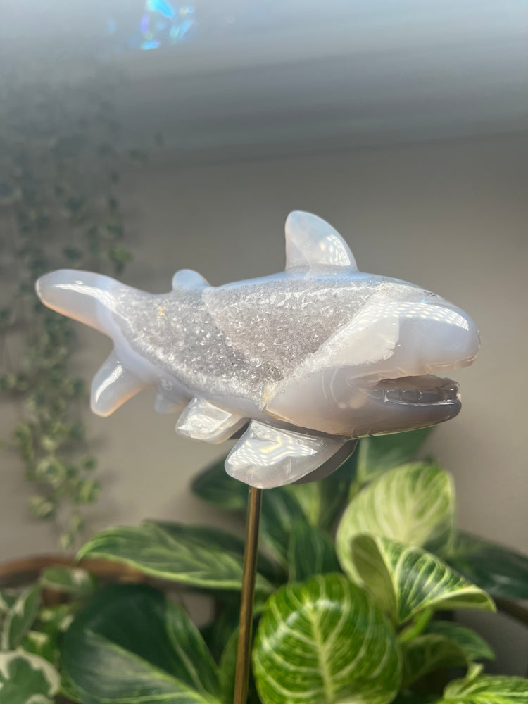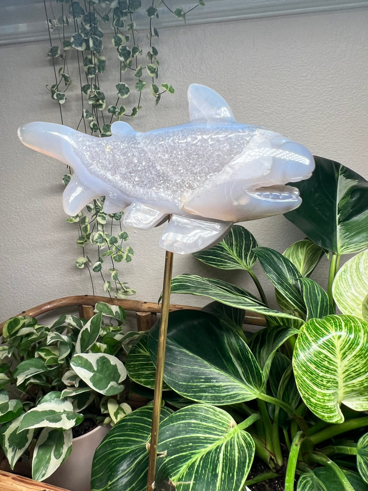 Rare* only one available. The friendliest shark you’ll ever meet! This guy is nearly the size of a real great white (just kidding! Haha! but he is a big Plant Crystal! He also glows and changes color in sunlight!
