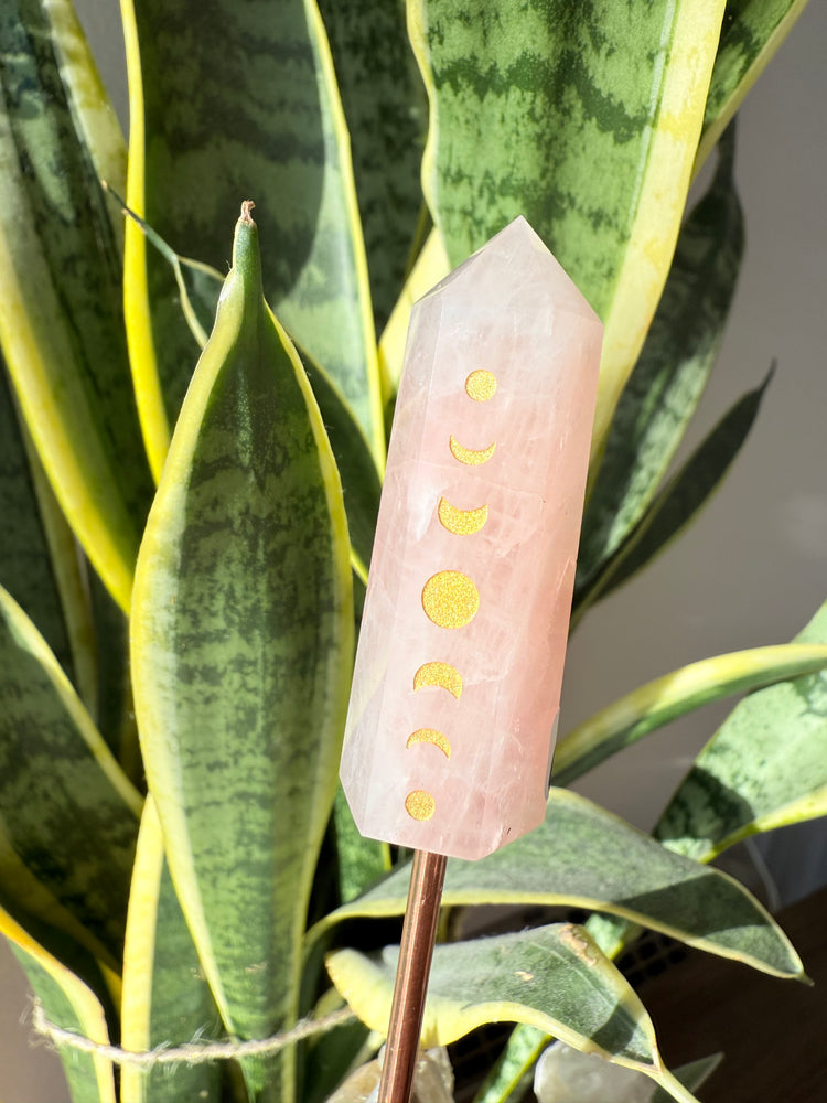 🌙 Rose Quartz Plant Crystal Moonphase Tower — a reminder that the heart, like the moon, moves through cycles of softening, releasing, and blooming again.