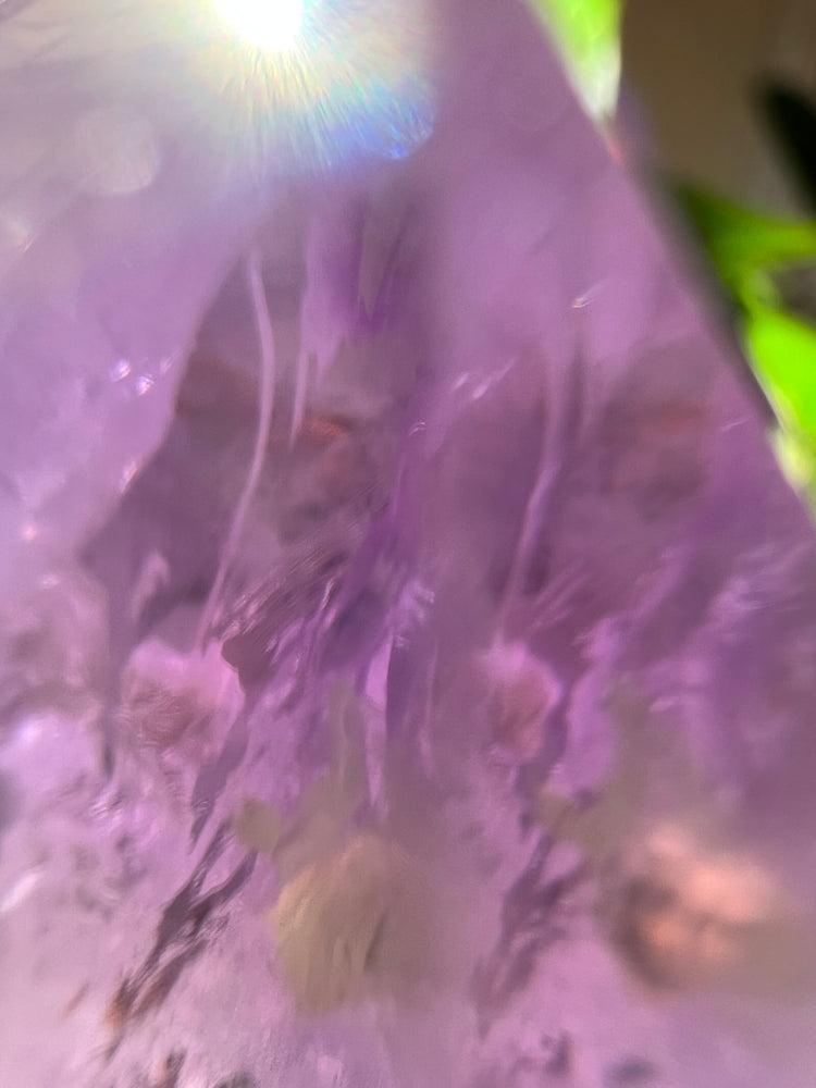 big amethyst point with natural symmetry creating a natural pyramid of energy. Has beautiful, natural gradient of lavender and deep purple colors with natural rainbows!