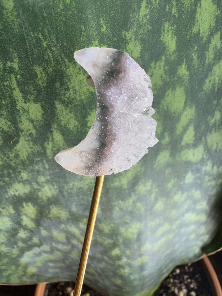 Pink amethyst moon with yellow, green and a raw, chunky quartz edge with rainbow inclusions.