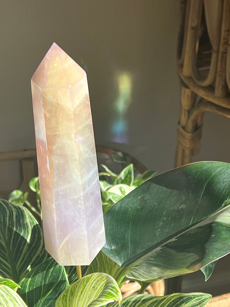 Angel aura rose quartz tower Plant Crystal has Beautiful pink undertones covered in pastel rainbows that reflect like a disco ball when placed in direct sunlight! Shine bright, grow with ease and manifest your heart’s most abundant desires in your own planty sacred garden with this incredible Plant Crystal by your side.