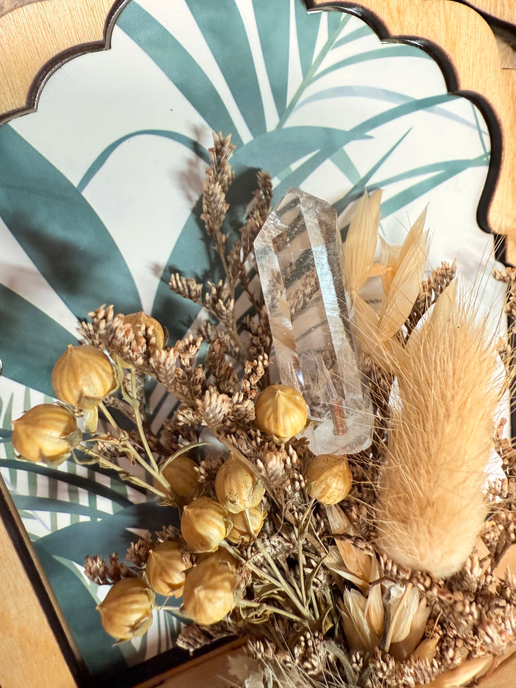 At the back of the altar is a softly reflective acrylic mirror, intentionally placed to reflect the Plant Crystal and florals.